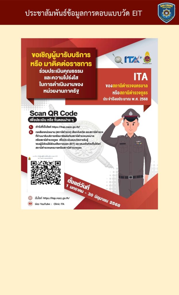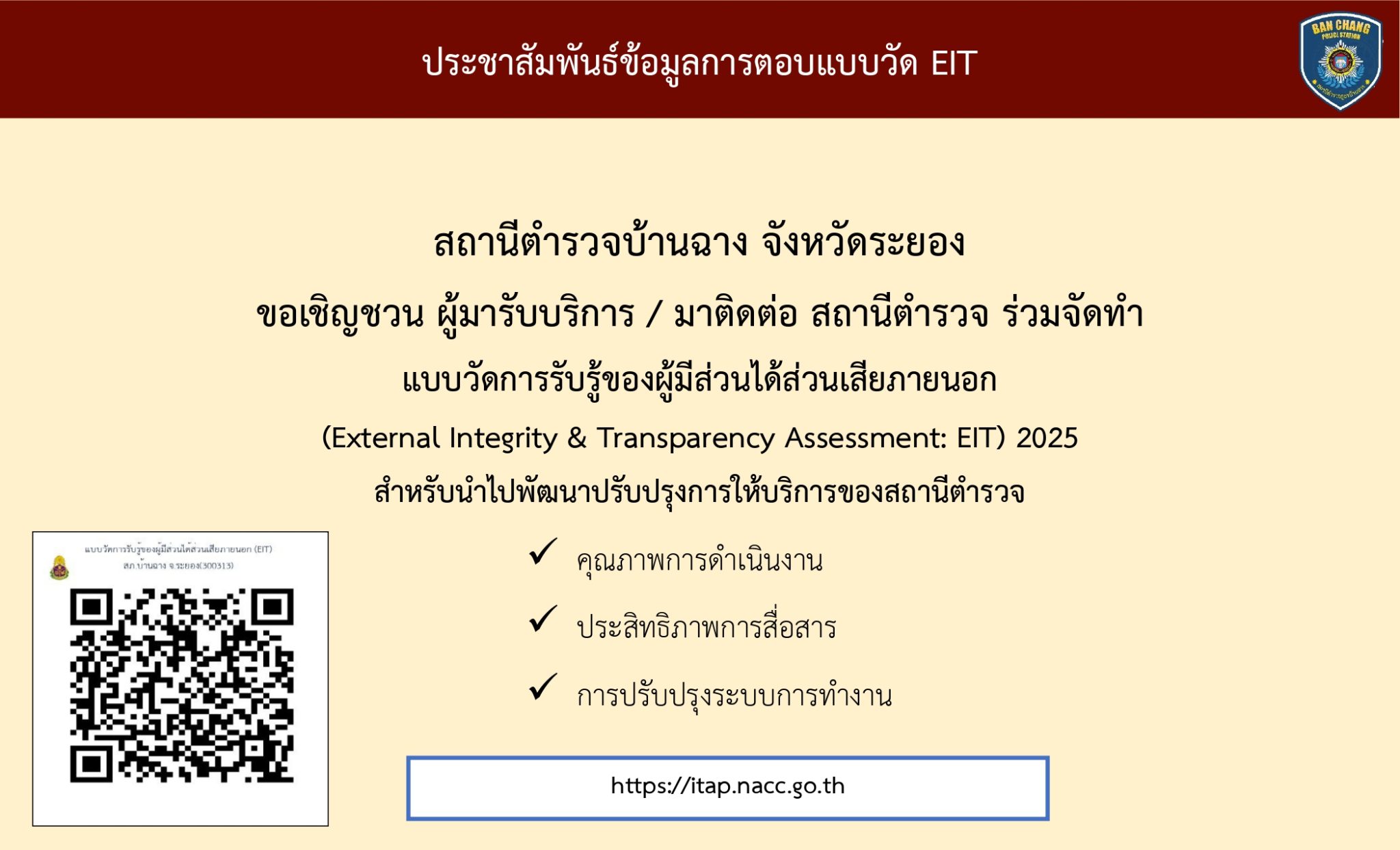 แบบวัดการรับรู้ของผู้มีส่วนได้ส่วนเสียภายนอก(EIT) External Integrity & Transparency Assessment (EIT) (Integrity & Transparency Assessment: ITA) การประเมินคุณธรรมและความโปร่งใสในการดำเนินงานของ สถานีตำรวจนครบาล/สถานีตำรวจภูธร ประจำปีงบประมาณ พ.ศ.2568