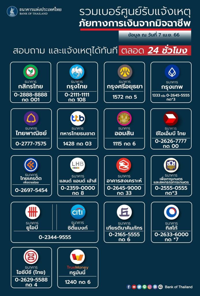 อัพเดท!!! รวมเบอร์ศูนย์รับแจ้งเหตุภัยทางการเงินจากมิจฉาชีพ : ข้อมูลจากธนาคารแห่งประเทศไทย